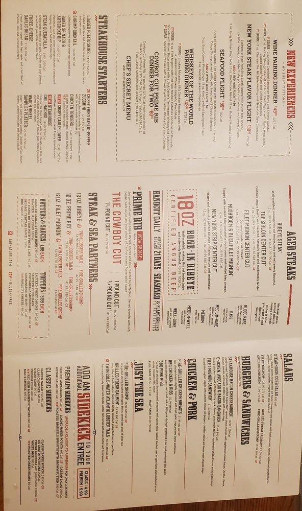 Your choice of any Steakhouse Starter to share. Upgrade to Wagon Wheel Sampler 5Entrees Choose any 2 of the entrees listed and 4 Classic Sidekicks.Top Sirloin 8oz. Filet Mignon 6oz. 5person Ribeye 12oz. 5person New York 12oz. Grilled Fresh Salmon FireGrilled Chicken BBQ Chicken Ribs Half Rack BBQ Baby Back Ribs Full Rack FireGrilled Jumbo ShrimpDessert Round out your feast with any 1 of our decadent desserts.